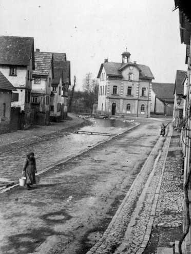 Das Bild aus dem Jahr 1920 zeigt die Brauhausstraße mit Fußgängerstegen über den Bieberbach und dem Rathaus im Hintergrund, fotografiert in Höhe des heutigen Friseur-Salons Gnau.
